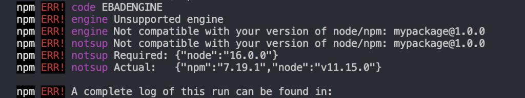 できたらエラーで知らせてほしいので、engine-strictフラグを設定します。