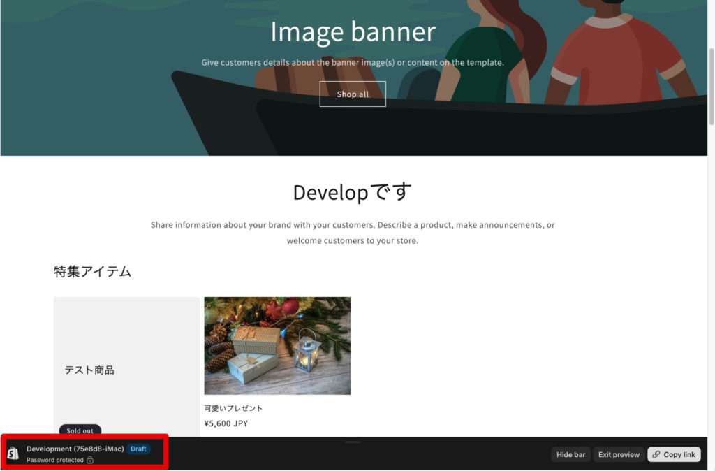 Share your theme previewを開くと、Shopifyが提供する一時的な公開URLにアクセスできます。内容は127.0.0.1:9292と同じです。このURLは外部の人と共有も可能です。