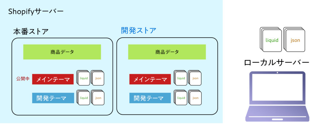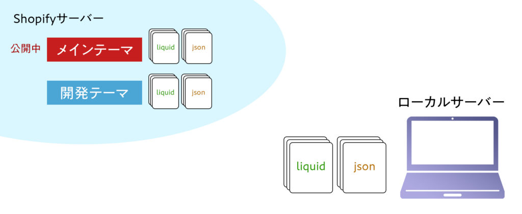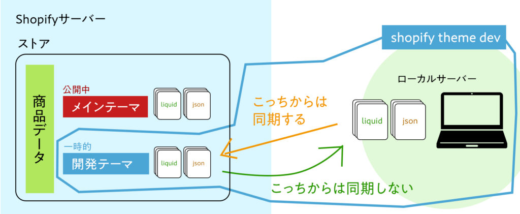 - ローカルで行ったliquid・jsonの編集、ファイル追加は開発テーマに同期される